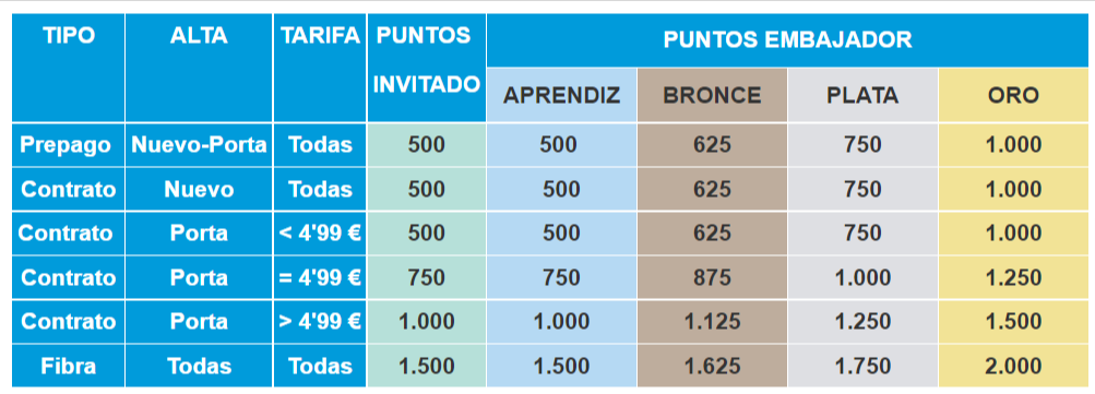 El total de puntos extra para el invitador dependerá del servicio activado, de la tarifa elegida por el invitado y del número de invitados conseguidos en los 12 meses previos. En función de dicho número de invitados, el invitador pasará a formar parte de una de las cuatro categorías listadas más abajo. Los cambios de categoría se producirán tras cada uno de los canjes trimestrales de puntos.